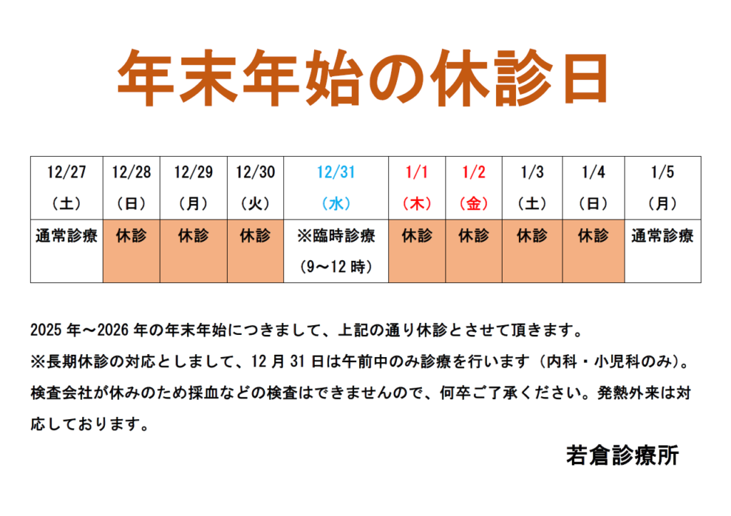 2025年~2026年の年末年始は12月28日(日)~1月4日(日)まで休診とさせていただきます。